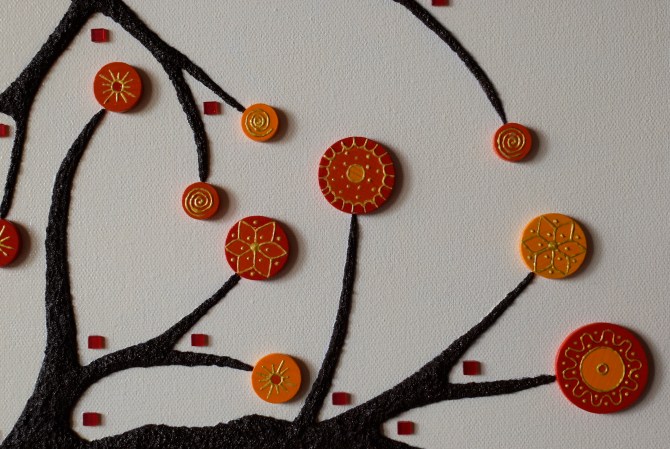 L’albero e gli altri elementi che costituiscono il quadro sono in rilievo. Per questo e per lo spessore della tela (3,8 cm) il quadro non necessita di cornice.