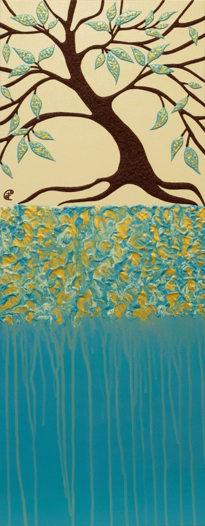 L’albero e gli altri elementi che costituiscono il quadro sono in rilievo. Per questo e per lo spessore della tela (3,8 cm) il quadro non necessita di cornice.