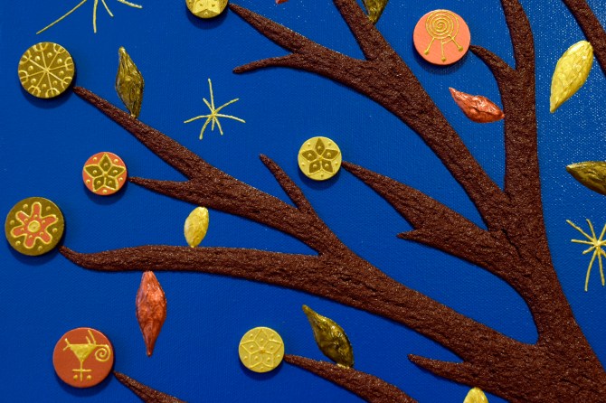 L’albero e gli altri elementi che costituiscono il quadro sono in rilievo. Per questo e per lo spessore della tela (3,8 cm) il quadro non necessita di cornice.