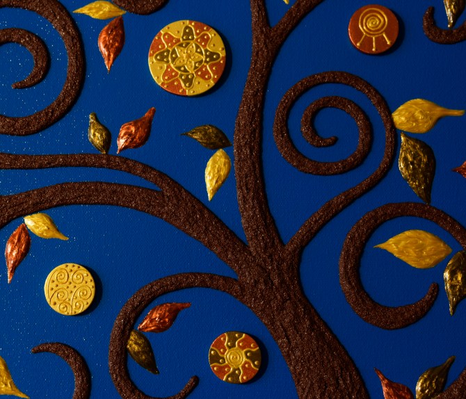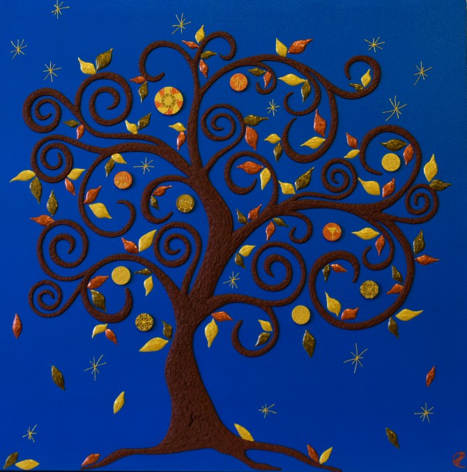 L’albero e gli altri elementi che costituiscono il quadro sono in rilievo. Per questo e per lo spessore della tela (3,8 cm) il quadro non necessita di cornice.