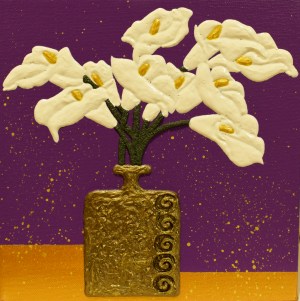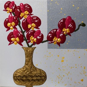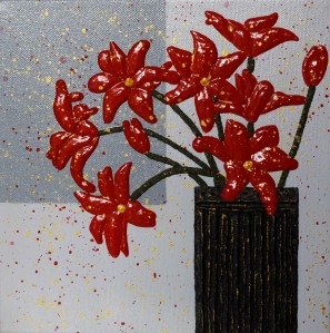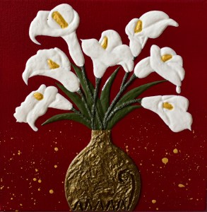 I fiori, gli steli ed i vasi sono in rilievo. Per questo e per lo spessore della tela (3,8 cm) i quadri non necessitano di cornice ed oltre ad essere appesi possono essere poggiati in verticale come un soprammobile.
