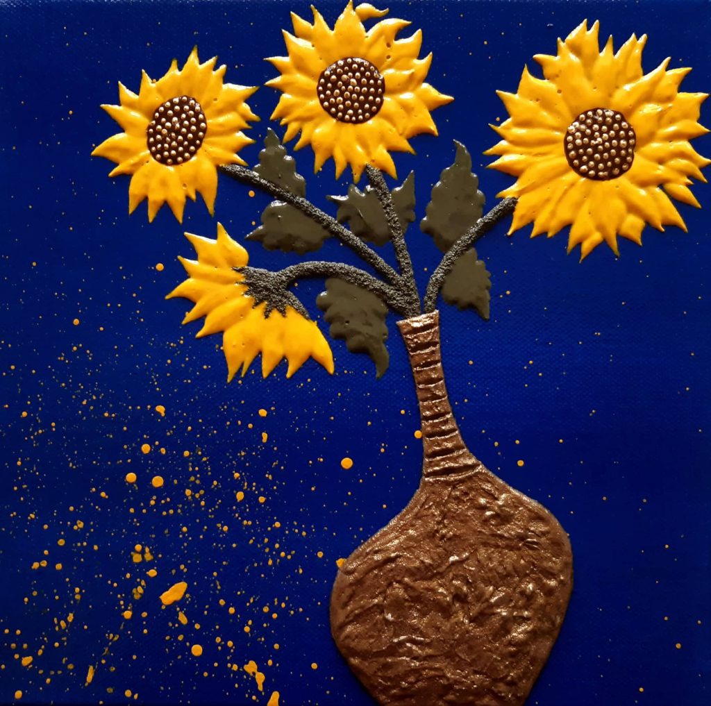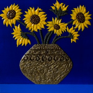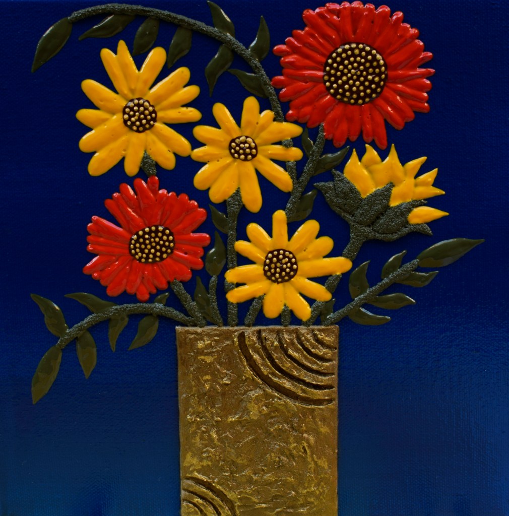 The flowers, the stem and the flowerpot are in relief. For this and for the thickness of the canvas (3.5 cm) the pictures do not need a frame and besides being hung they can be placed vertically as an ornament.