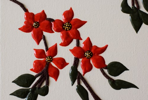 I rami, le foglie e i fiori, che costituiscono il quadro, sono in rilievo. Per questo e per lo spessore della tela (3,8 cm) il quadro non necessita di cornice.