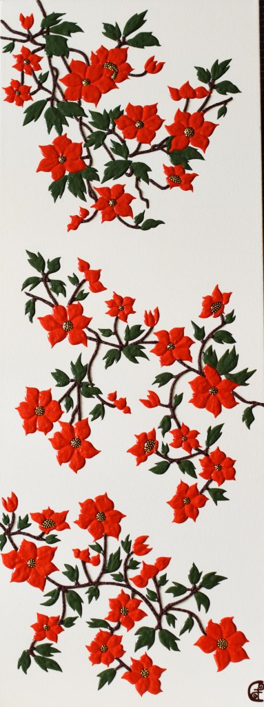 I rami, le foglie e i fiori, che costituiscono il quadro, sono in rilievo. Per questo e per lo spessore della tela (3,8 cm) il quadro non necessita di cornice.