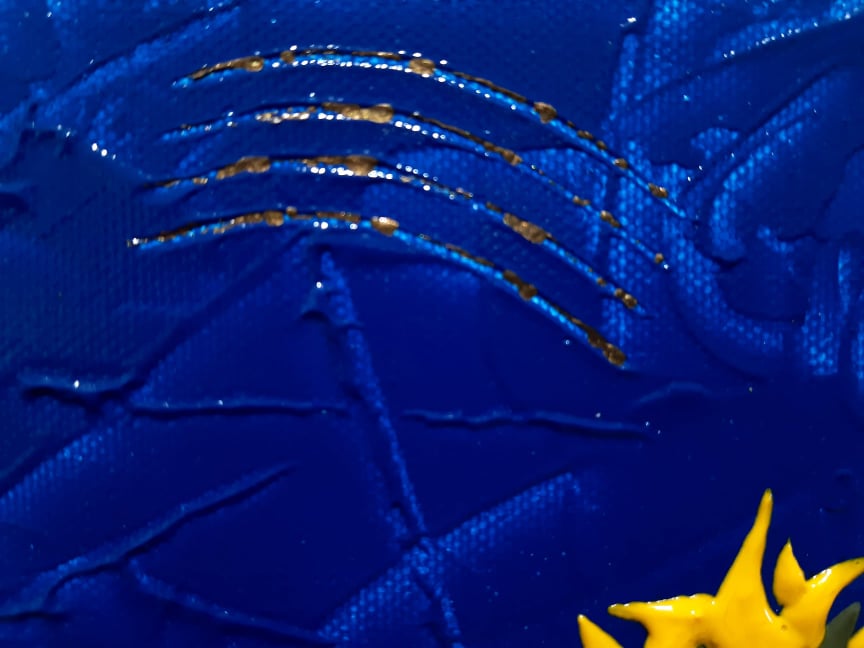 The flowers are in relief. For this and for the thickness of the canvas (3.8 cm) the picture does not need a frame.
