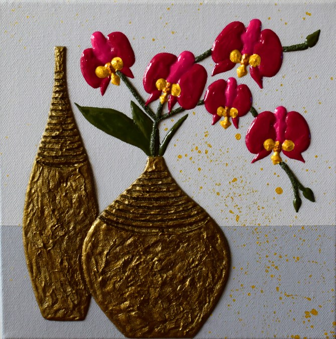 The flowers, the stem and the flowerpot are in relief. For this and for the thickness of the canvas (3.5 cm) the pictures do not need a frame and besides being hung they can be placed vertically as an ornament.