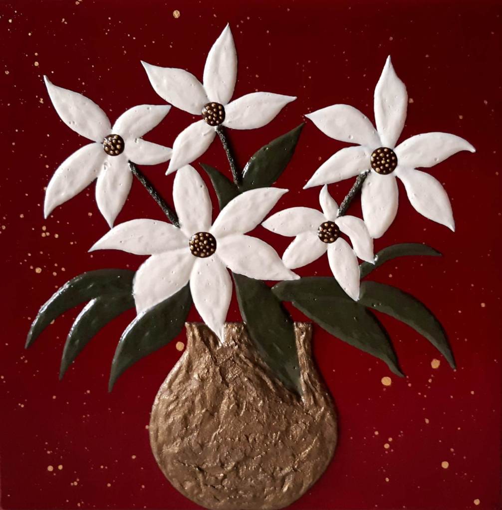 I fiori, gli steli ed i vasi sono in rilievo. Per questo e per lo spessore della tela (3,8 cm) i quadri non necessitano di cornice ed oltre ad essere appesi possono essere poggiati in verticale come un soprammobile.
