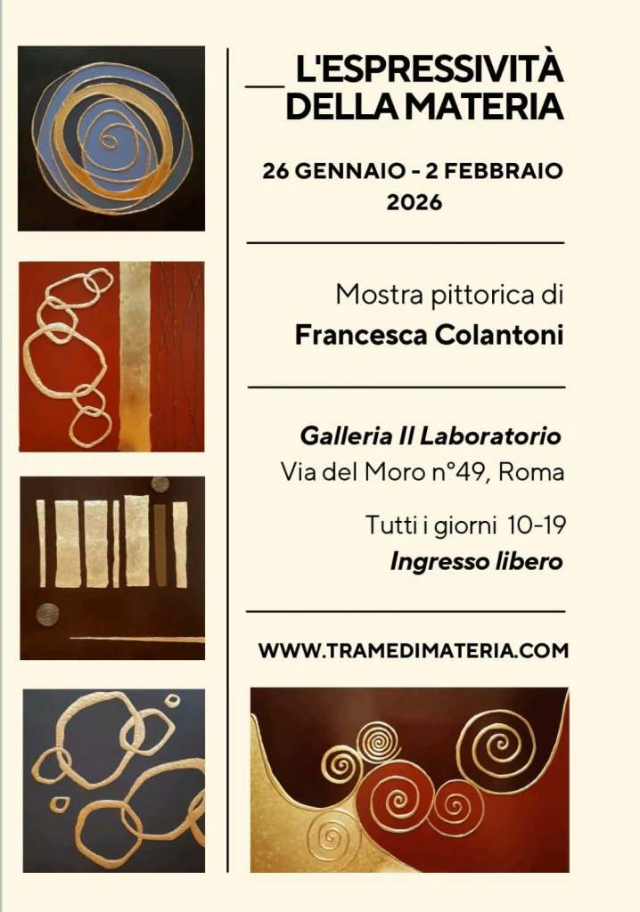 Dal 26 gennaio al 2 febbraio 2026 la mia mostra personale dal titolo “L’espressività della materia” ha trovato spazio presso la Galleria “Il Laboratorio”, in Via del Moro n°49 (Trastevere – Roma).