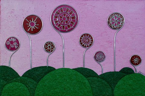 Francesca Colantoni: Serie “Fiori-gioiello su tela con fondo di giornale, spartito musicale vintage o juta” 21 x 26 cm 2023